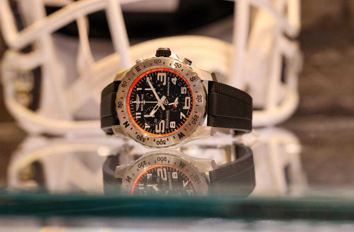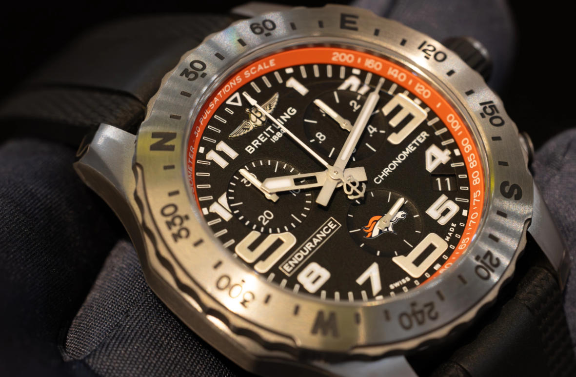 The buy fake Breitling Endurance Pro 44 NFL Denver Broncos Edition watches comes in a larger 44 mm x 12.5 mm, lightweight titanium case, with a 52.49 mm lug-to-lug distance, on a black rubber strap. It’s powered by Breitling’s COSC-certified thermocompensated SuperQuartz movement, which displays hours, minutes, small seconds, date, and features a chronograph, as well as a rotating compass bezel. (To use an analog watch as a compass, you point the hour hand at the sun, and then find the midpoint between the hour hand and the 12 o’clock position on the dial. In the Northern Hemisphere, the midpoint indicates south, while in the Southern Hemisphere, it indicates north. A rotating bezel allows you to mark the north or south bearing, to better keep track of your direction.) The NFL shield is engraved on the caseback, and a raised, full-color version of each team’s respective logo is printed on the small seconds subdial at 6 o’clock. The flange is painted in each team’s dominant color hue and has a 30-pulsations pulsometer scale to quickly measure your heart rate. $4,600