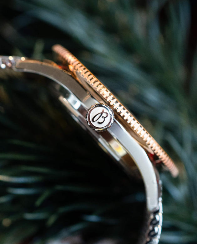 The dial of the Highlands features a beaming sunburst finish on all four colors. The mustard, which now that I think of it is really more of a butterscotch, is particularly vibrant. The dateless layout remains nearly identical to the larger ’57 models, with oversized applied indices and the massive arrow hour hand and sword-style minutes. To match the rose gold of the bezel, the indices and hands (as well as the bezel hashes) are rendered in rose gold as well. The only difference in these dials seems to have been made to accommodate the reduced size: Gone is the small 15-minute numbering along the minute track. While I focused on the mustard dial here, I wanted to mention the brown dial, which was somewhat enigmatic. At times, it shines in its true earth tone, but other times it seemed sapped of energy and disappointingly muted.
