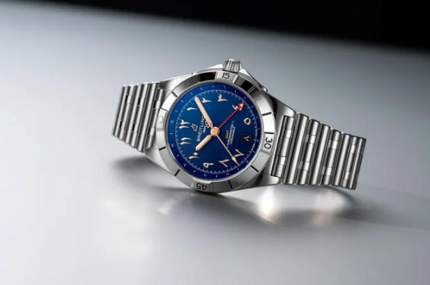 The 1:1 clone Breitling Chronomat Automatic GMT 40 Malaysia Edition watches features the dark blue satiné soleil dial, a rich tone inspired by the blue of Malaysia’s national flag — representing harmony and unity. Encircling it is a dark blue réhaut, creating visual depth while framing the watch’s most distinctive feature: its Eastern Arabic numerals.